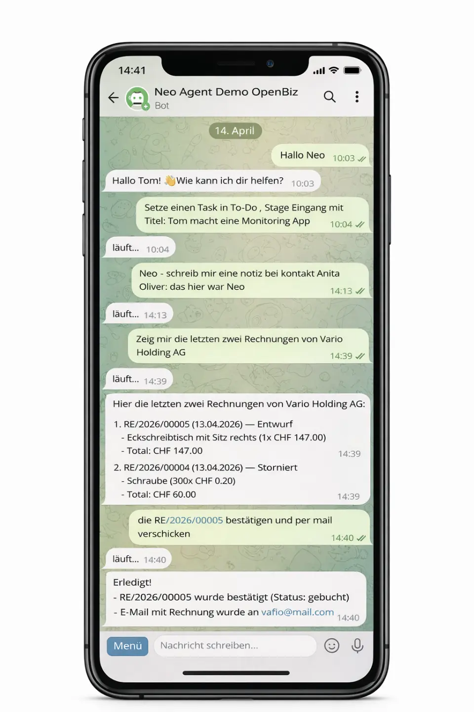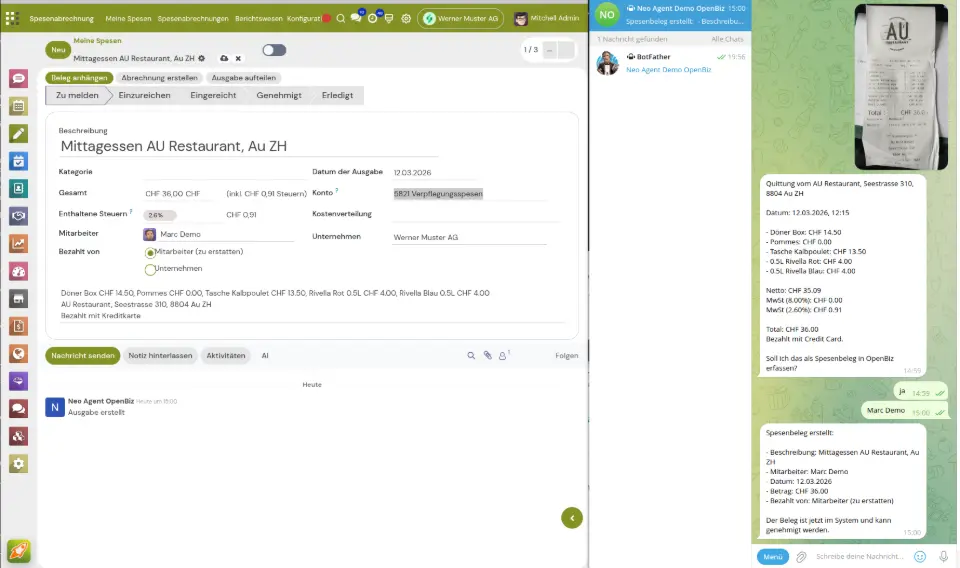 Foto der Quittung per Handy in den Neo Agent hochladen -- OpenBiz erkennt die Daten und erstellt eine Spesenbuchung mit der Konsumation, Beträge und Steuern.